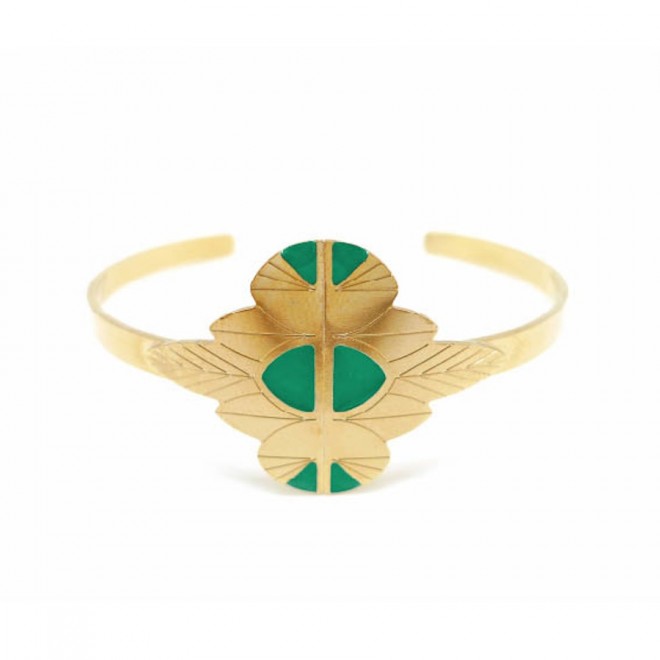 Jonc ajustable en laiton (garanti sans nickel), doré à l’or fin (24 carats – 1 micron d’épaisseur) et émail vert tropical.Modèle de la nouvelle collection de Nadja Carlotti. Inspirée de la baie de Kanuméra en Nouvelles-Calédonie..On se laisse charmer par ces bijoux originaux et délicats.